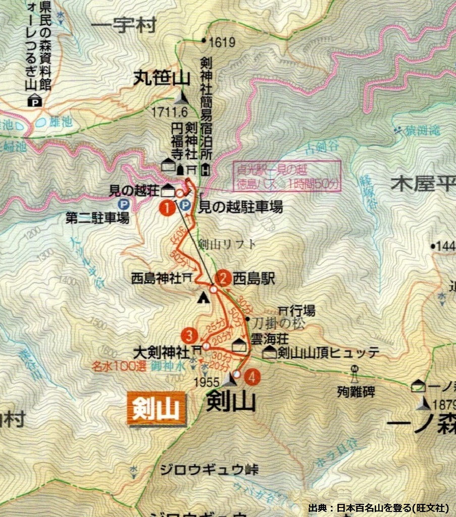 ※見の越駅12:00~剣山登山リフト~12:15西島駅12:20~13:00剣山(山頂)13:20~13:35大剣神社~13:50西島駅14:00~剣山登山リフト14:15見の越駅