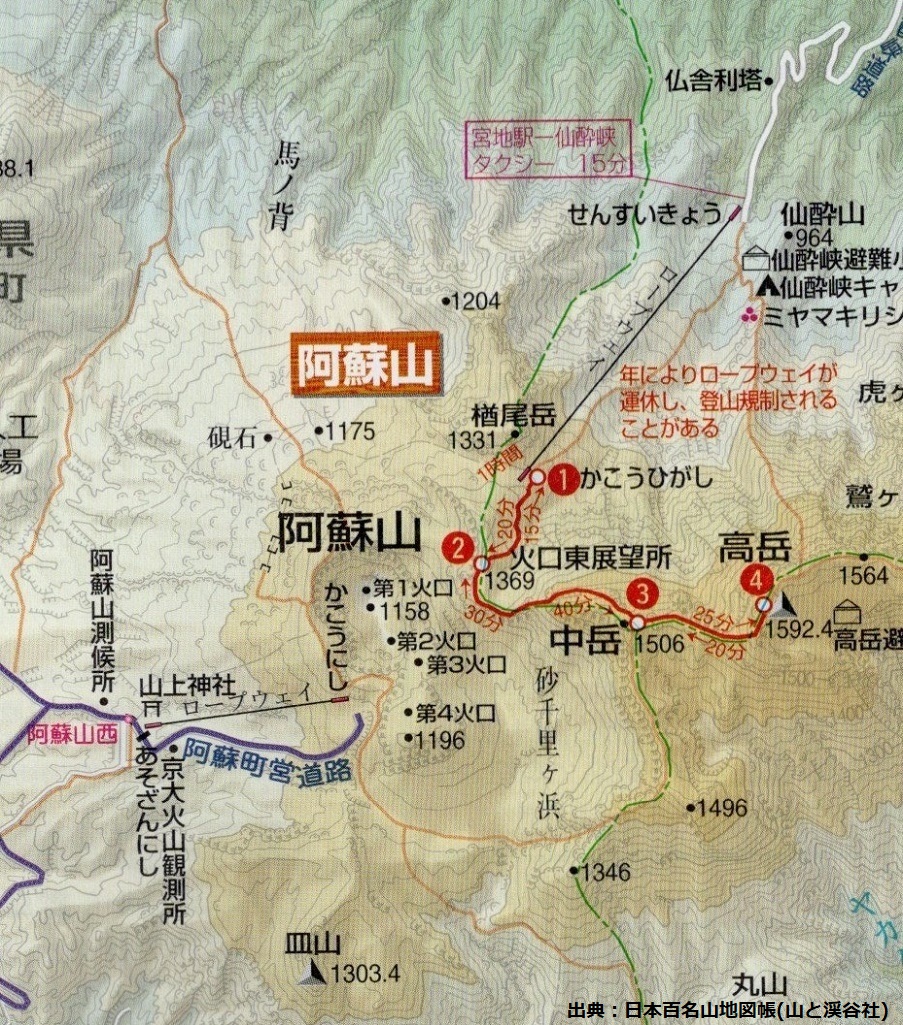 | ※14:00仙酔峡駐車場~仙酔峡駅~14:15ロープウエイ~14:25火口東口駅14:30~15:00中岳~15:25高岳(山頂)15:45~16:25火口東口駅16:45~ロープウエイ~16:55仙酔峡駅17:15~県道11号~国道442号~18:45黒川温泉「新明館」(入浴)20:30~国道442号~県道11号~21:10牧ノ戸峠駐車場(車中泊) (走行距離54.8Km) |