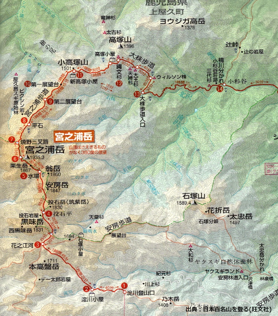 | (6)草加駅7:15~8:24羽田空港9:30~ANA621便~11:15鹿児島空港(バス) ~鹿児島市役所(タクシー)~12:50鹿児島本港(南埠頭)13:10(フェリー)~14:55屋久島(宮之浦港)~15:00オリックスレンタカー屋久島宮之浦カウンター15:15~島内散策~県道77号~17:00屋久島いわさきホテル(入浴)18:00~県道77号~県道592号~19:50淀川登山口 (車中泊)(走行距離125.5Km) (7)宮之浦岳 ※淀川コース 登山口標高1,360m 標高差576m ※車中泊起床5:00淀川登山口5:20~5:50淀川小屋~7:05花之江河~7:45投石岩場~8:30水場~9:00宮之浦岳(山頂)9:05~10:30花之江河~11:45淀川登山口 淀川登山口12:15~島内散策~県道592号~県道77号~16:15縄文の宿「まんてん」(入浴・夕食)21:00~県道77号~県道592号~22:30荒川登山口(車中泊)(走行距離70.1 Km) (8)縄文杉 ※荒川登山口コース(歩行距離21.1Km) ※車中泊起床4:30荒川登山口5:00~トロッコ道~6:30大株歩道入口~7:50縄文杉8:15~9:05大株歩道入口~トロッコ道~10:20荒川登山口 荒川登山口11:00~県道592号~島内散策~県道77号~15:10オリックスレンタカー屋久島宮之浦カウンター15:30~15:35宮之浦港 (走行距離46.7Km)(走行距離242.3Km) |