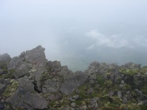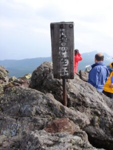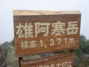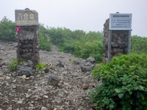 車中泊起床3:30、登山口(滝口)を4:00出発、阿寒湖畔を左手に見て進み、右手に太郎湖を見ながら針葉樹林帯登って行く3合目を過ぎたころから5合目辺りまで結構きつい登りが続く、6合目辺りで眼下に雌阿寒岳と阿寒湖を眺めることが出来た。さらに進み8合目の開けた場所に気象観測所跡地が有り立派で頑丈な門柱でした、さらに進むと霧に覆われた頂上が見えた、最後は滑りやすいガレ場でしたが3時間弱で6:45山頂に到達。