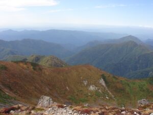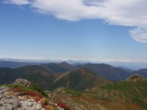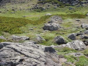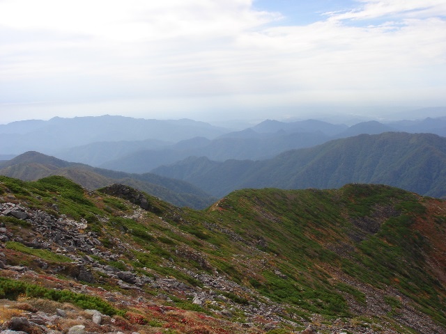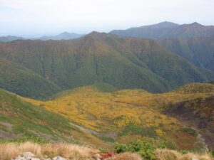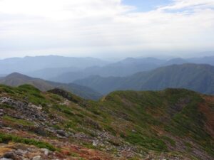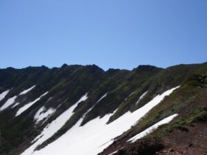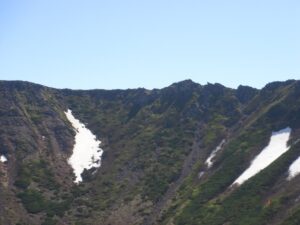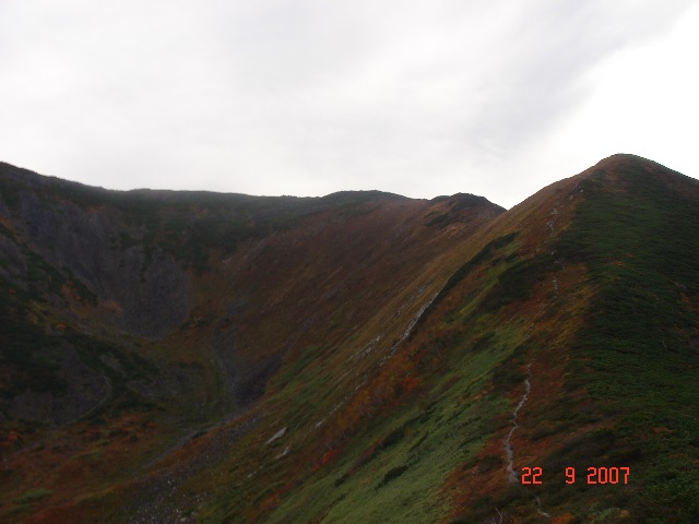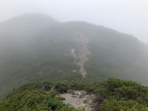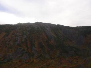 一休み後10:00山荘を出発、樹林におおわれたジグザク道の急斜面を登って命の泉着く。ここを過ぎるとハイマツ帯に成るが急登が続くがやがて、どんどん展望が広がり稜線に出る。カールの景色を見ながら半円を描くように登って行き12:55山頂に着く。