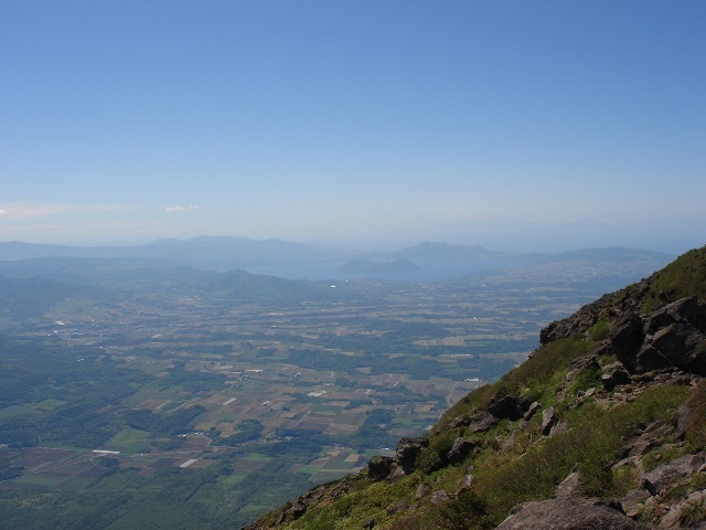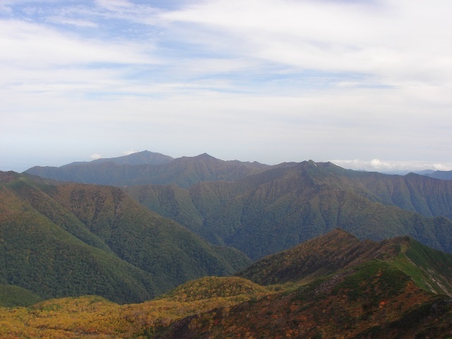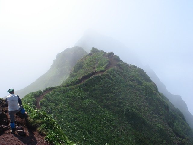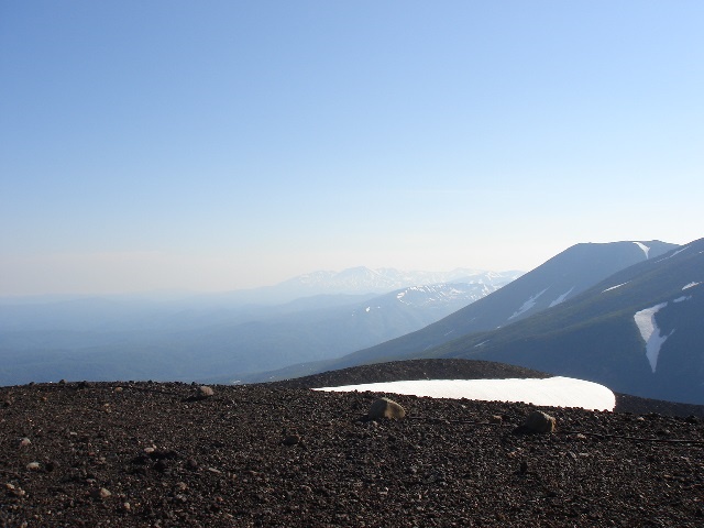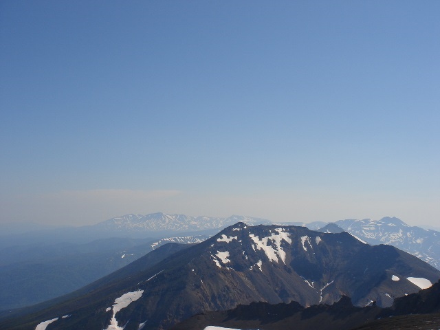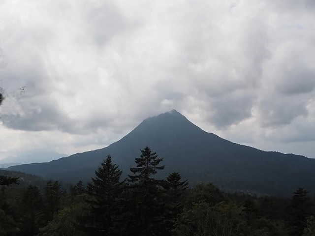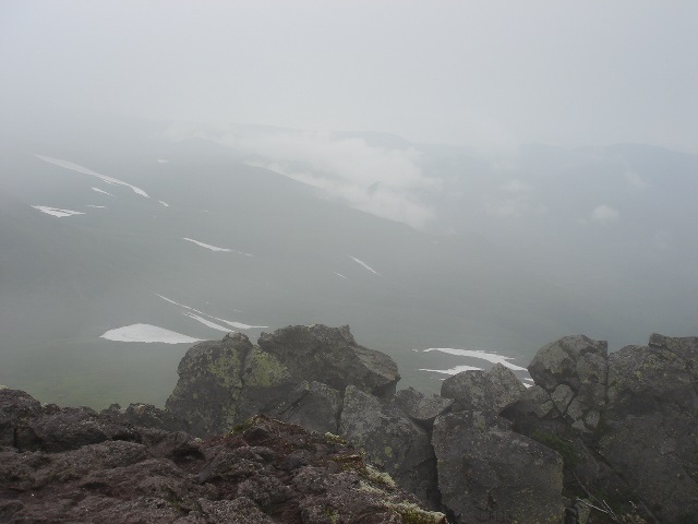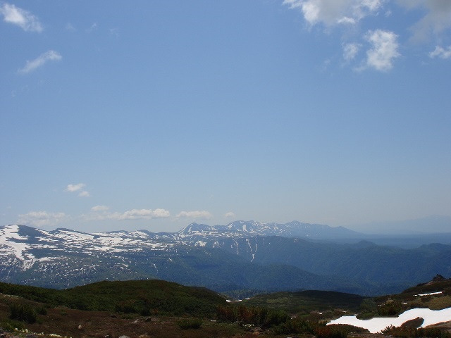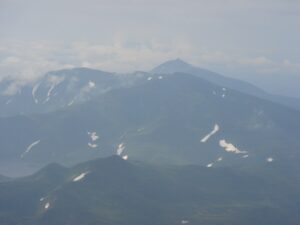 山頂到着時は、濃霧で何も見渡せなかったが、下山頃に少し霧が取れかすかに知床連山を見ることが出来た。
