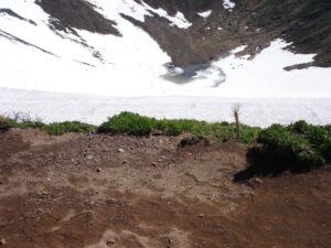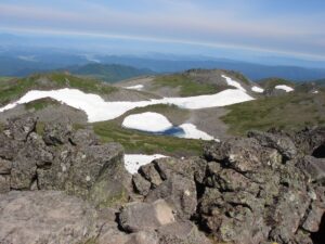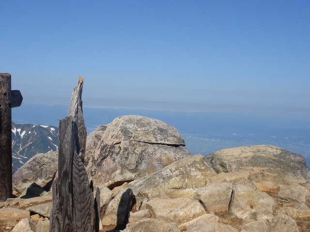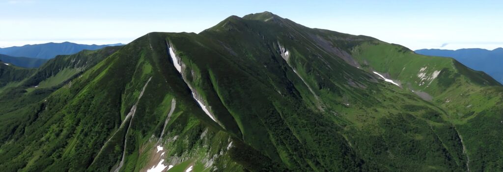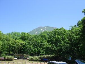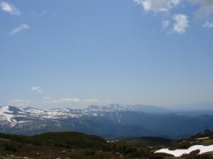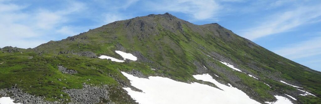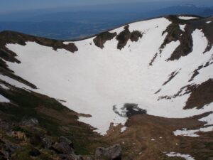 車中泊起床3:00、登山口(木下小屋)3:35出発、広葉樹の中を登って行く25分ほど歩くと「熊出没」の看板が立っていた遭遇しない事を願い先へ進む。登り傾斜は緩やかであるが同じような登りが続く、水場弥三吉水で喉を潤し頂上目指す樹林帯を終わる頃、視界が開け大沢口にたどり着く。雪渓歩きはアイゼンも装着なしで難なく渡りひたすら登り続ける事4時間余り7:30山頂着。
