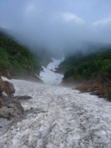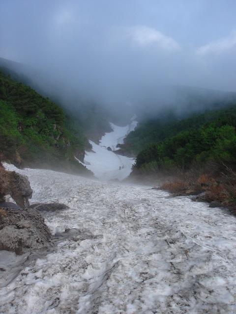 下りも登った同じコースを下る雪渓付近は霧に覆われていたが無事11:00登山口(木下小屋)に下山。