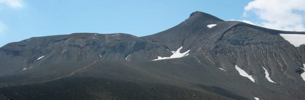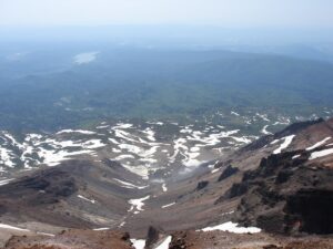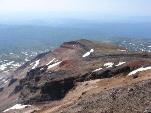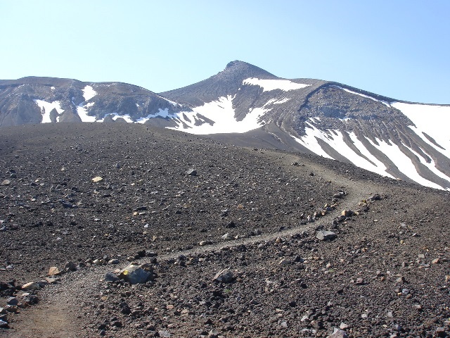 下りは、登山道をはずれ火山灰が積もった斜面を降りる。ちょうど富士山「須走コース」の砂走を思わせるところでした。急な小尾根を下りて避難小屋を過ぎ火山灰ガレキの続く緩やかな登山道を下って無事9:30望岳台登山口着。