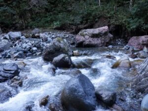 その中に何度も幌尻岳を経験した方がいて、小雨が収まってもこの登山道は、渡渉を繰り返し登って行くので途中水量が多くなり非常に危険で有る旨。