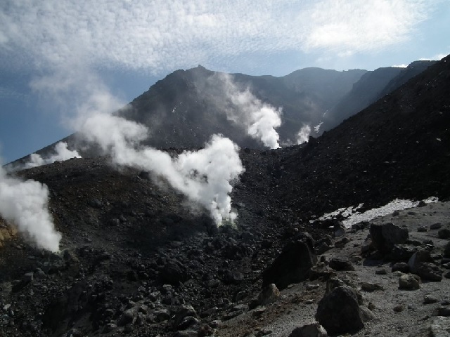 姿見駅12:15出発、右コース姿見の池まではなだらかな道も旭岳石室(避難小屋)を過ぎると登りがきつく岩や大きい石の多いガレ場、地獄谷を左手に見ながら何合目かを示す看板などは無くひたすら登って行くと四角い形をした金庫岩に到達、ここから頂上までは勾配がなだらかになり何とか北海道の最高地点13:45山頂に辿り着く。
