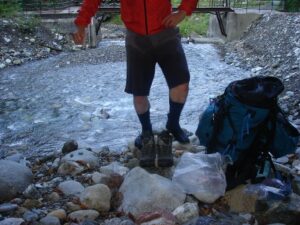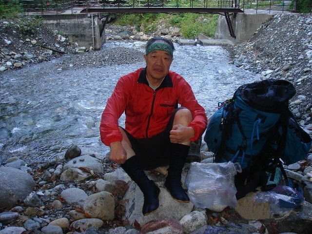 宿泊起床5:00、奥幌尻橋(登山口)5:30出発、単調な砂利道行きダム取水口に着く。ここから幌尻山荘まで渡渉が続くので、沢登り用靴(地下足袋)に履き替える。大小十数回の渡渉を繰り返し一番深い所では膝上まで浸かり結構大変でしたが無事9:45幌尻山荘に到着。