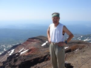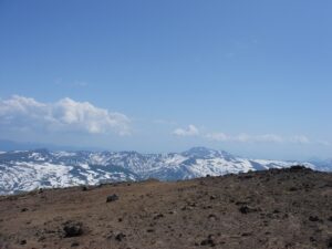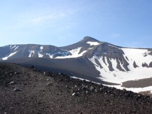 車中泊起床4:30、望岳台登山口5:00出発、晴天で御来光に一礼し山頂向け出発。時折最初目指す避難小屋が上方に見え隠れするだらだらと緩い登りが続き避難小屋に着く。小屋から少し進むと火山灰やガレキで登山靴は埋まり急斜面を登り尾根に辿り着く。目の前に十勝岳の全容が現れ天気も良く最後を登り切り7:45山頂に辿り着く。