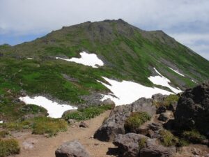 早朝3:00時起床、国民宿舎東大雪荘を3:20車で短縮登山口へ、登山口4:00登山開始、平坦な道を10分ほど歩くとトムラウシ温泉からの道に合流、暫く単調な尾根道を行くとカムイ天上に着く。ここからちょっとした上り下りや何度かの渡渉を繰り返しコマドリ沢へ、少し進むと雪渓が残っているが滑ることなく登れ、前トム平に着く。岩が敷き詰められた尾根を行くとお花畑と奇岩、巨岩が立ち並ぶトムラウシ公園と呼ばれるところを経てトムラウシ直下に着く。火山礫の大岩、小岩の急斜面を登り何とか8:20山頂に着く。